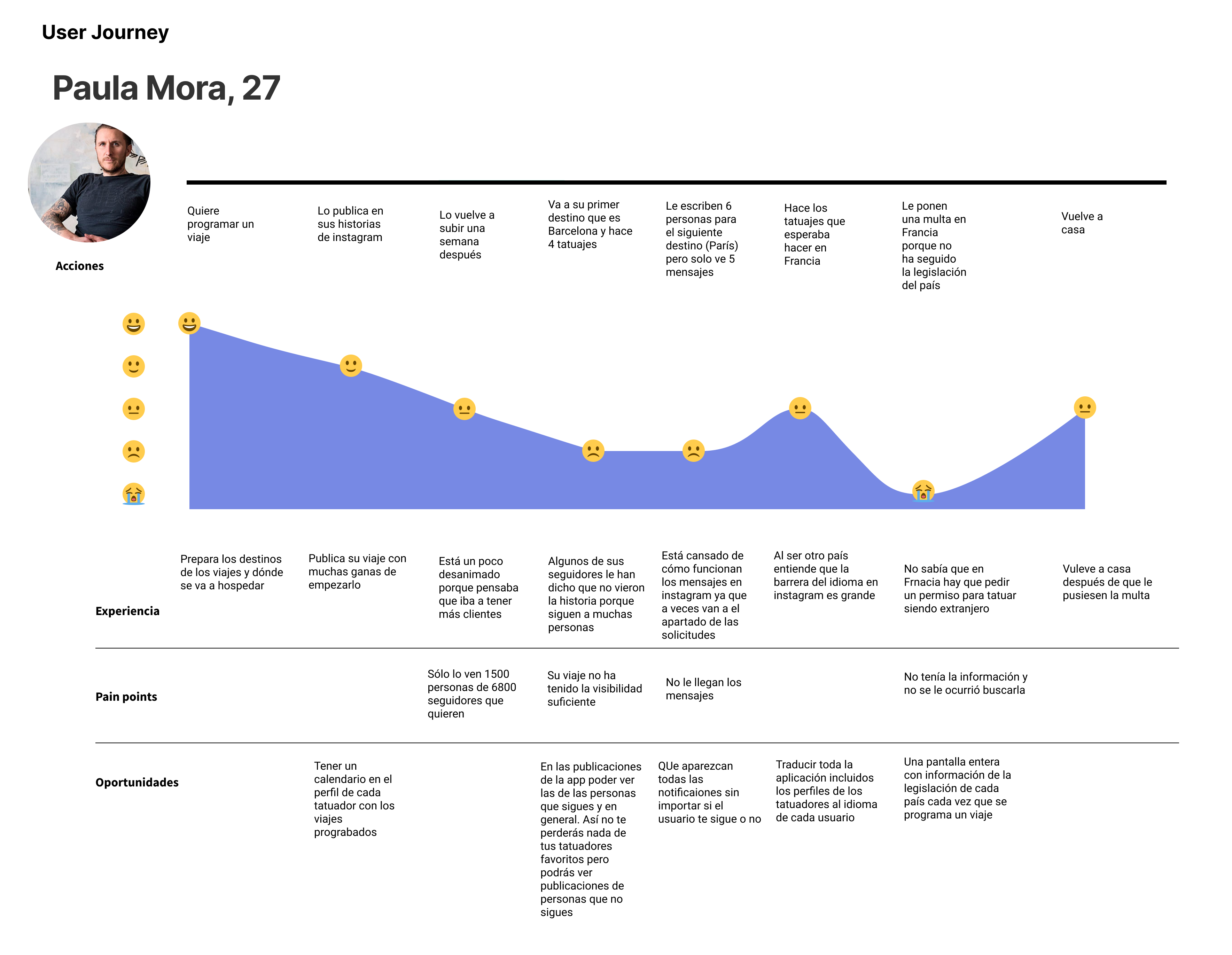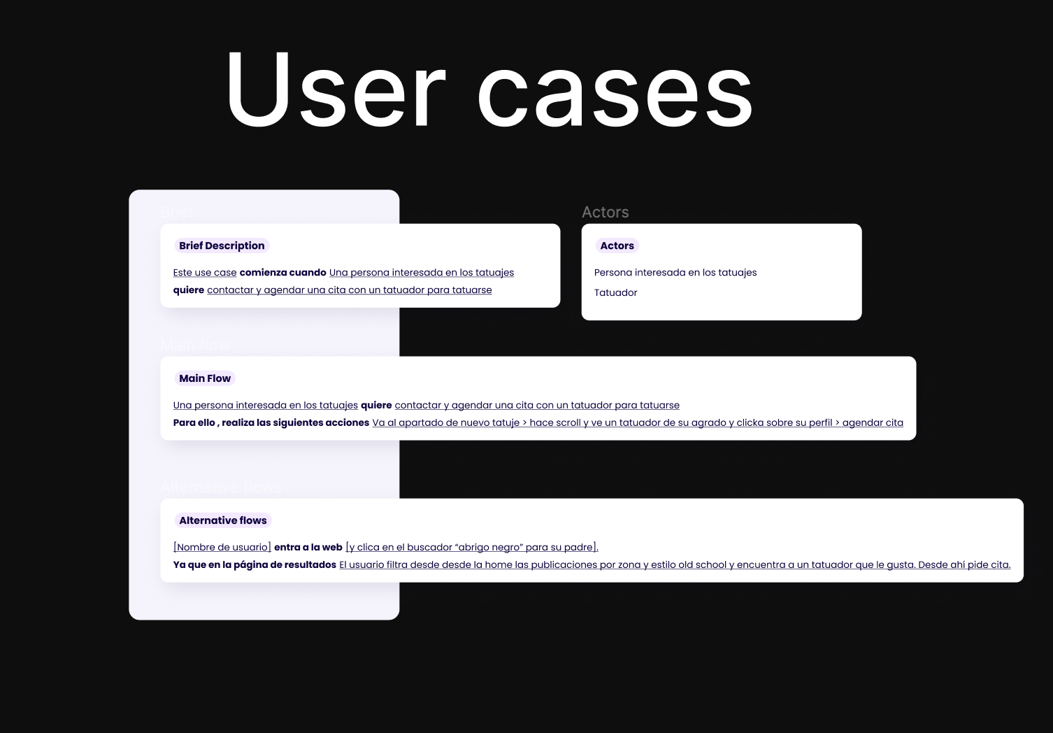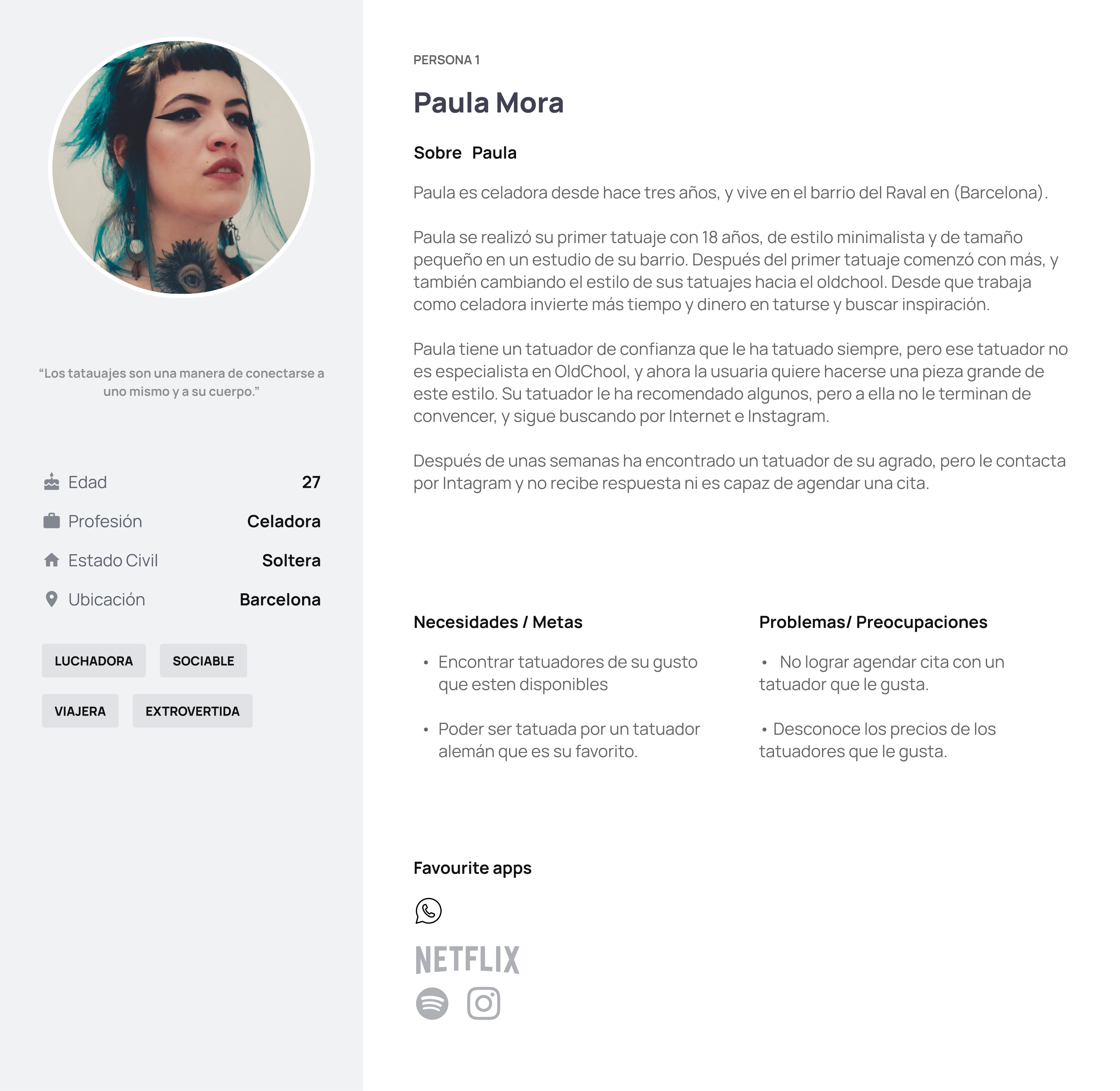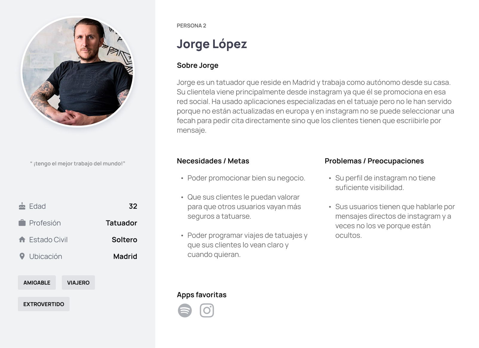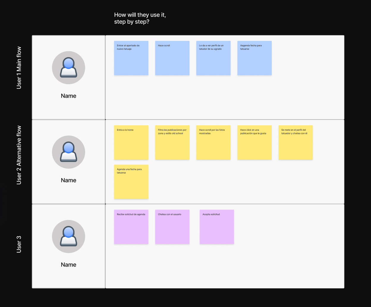 We started to define using the data from the research, and by first carrying out two User personas, for the two flows we have: tattoo artists and people interested in getting a tattoo.