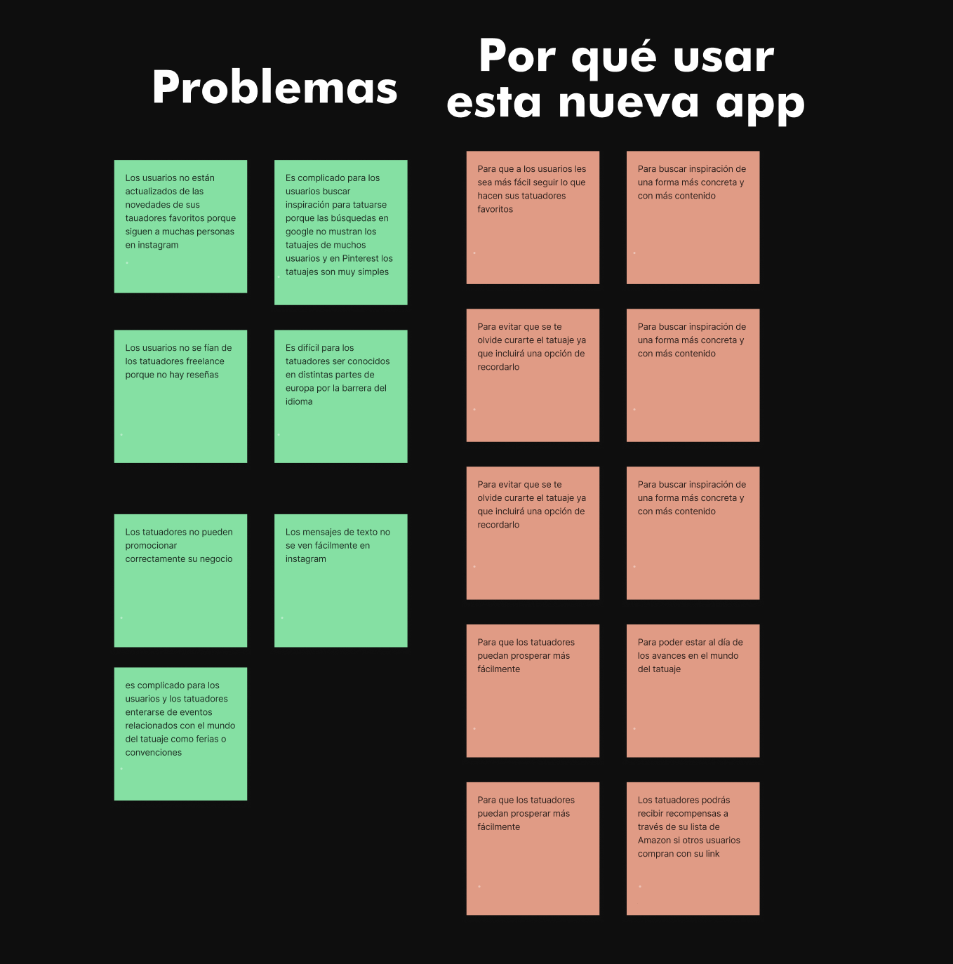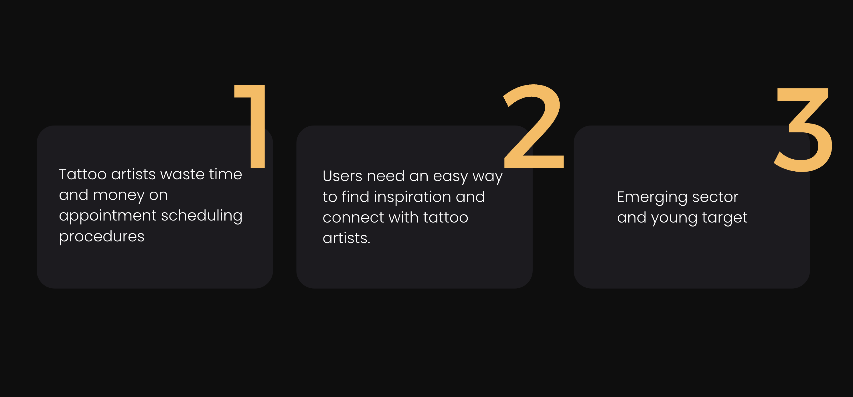 First of all, we decided to carry out an initial investigation of problems that could have a technological solution. This led us to delve into the tattoo community, observing the following stament problem: People interested in tattoos do not know how to hire new international freelance tattoo artists that adapt to their economic capacity, their style of tattoos and their health needs.