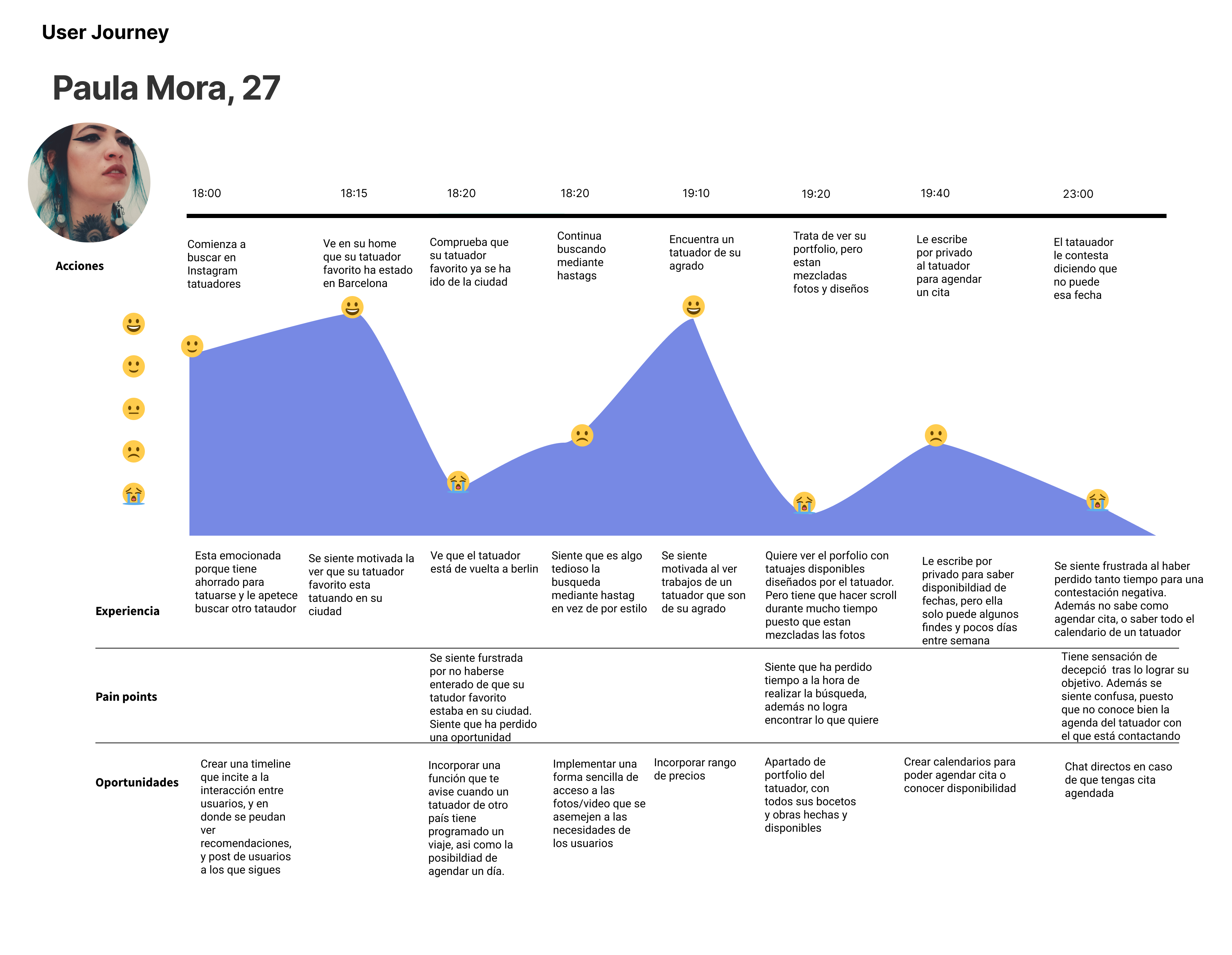During this phase, we gathered crucial information, such as tattoo artists spending a significant amount of time coordinating appointments through various methods of contact, such as Instagram, TikTok, WhatsApp, and phone. Meanwhile, individuals interested in getting a tattoo are unaware of an efficient method for making appointments.